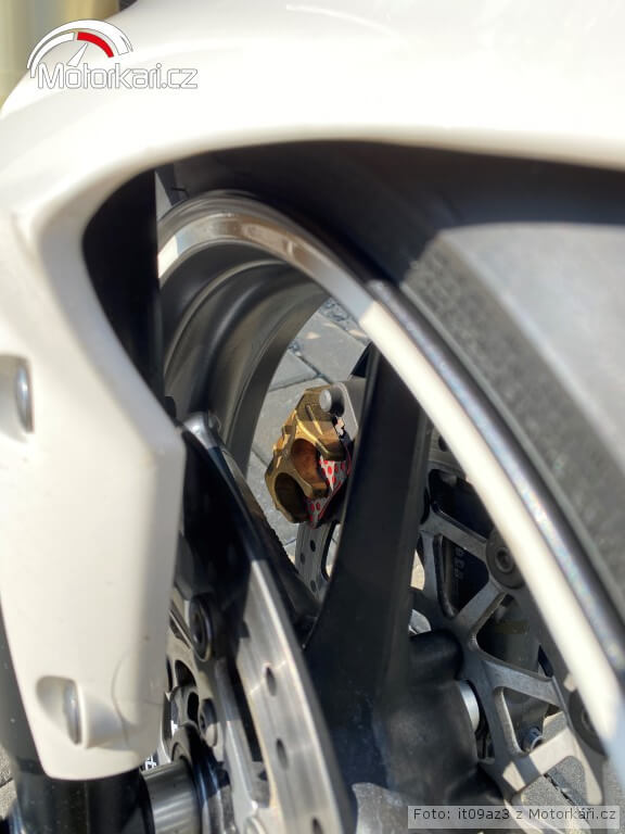 Původní brzdové destičky byly potřeba vyměnit. Rozhodl jsem se jít do značky Brembo a typ destiček jsem vybral SA. Odkaz zde. Líbí se mi červený design. Při bližším prozkoumání předního kola jsou červené destičky taková parádička. Brzdný účinek vnímám jako plně dostačující, brzdy i třmeny byly také vyčištěny.