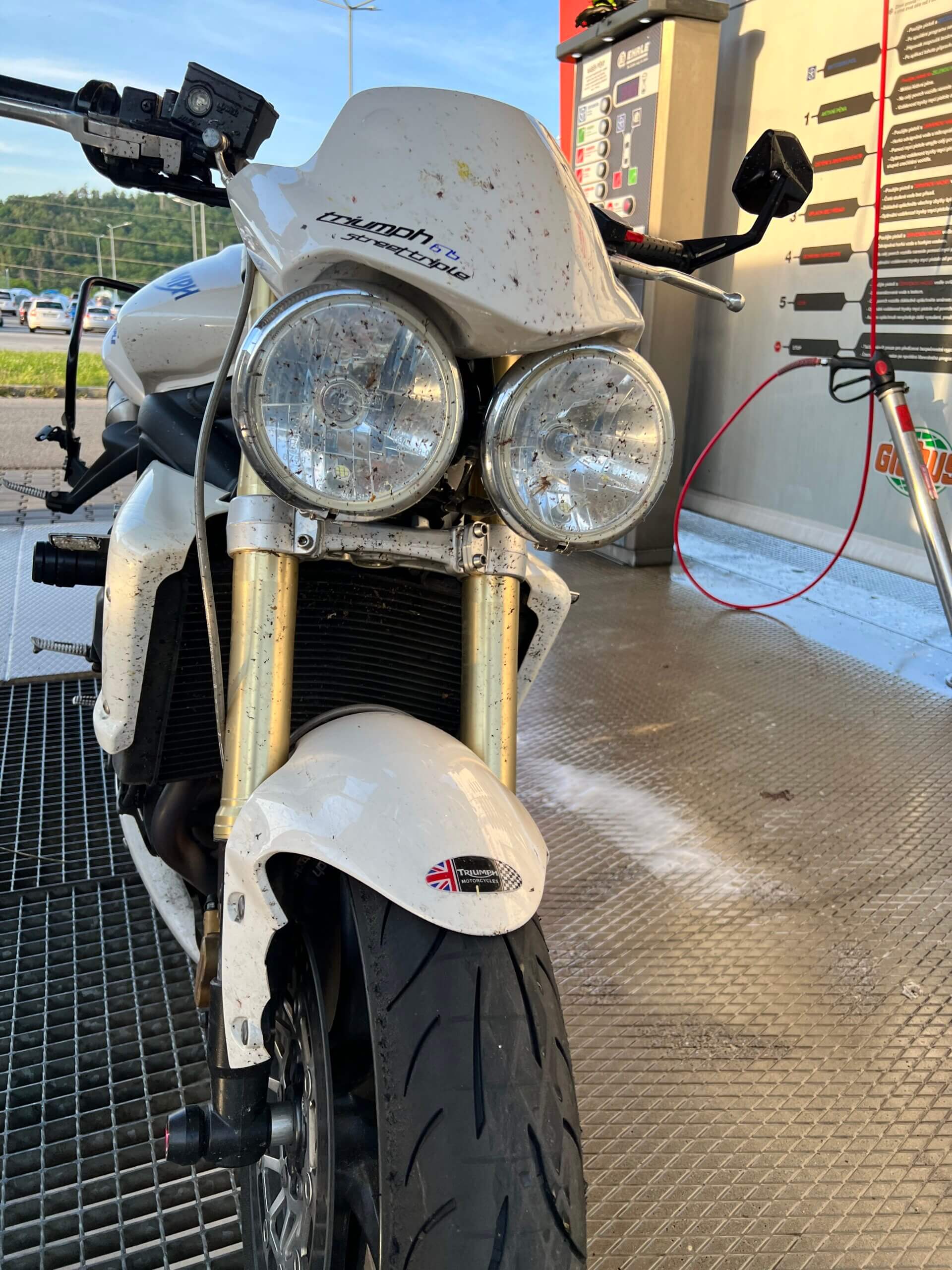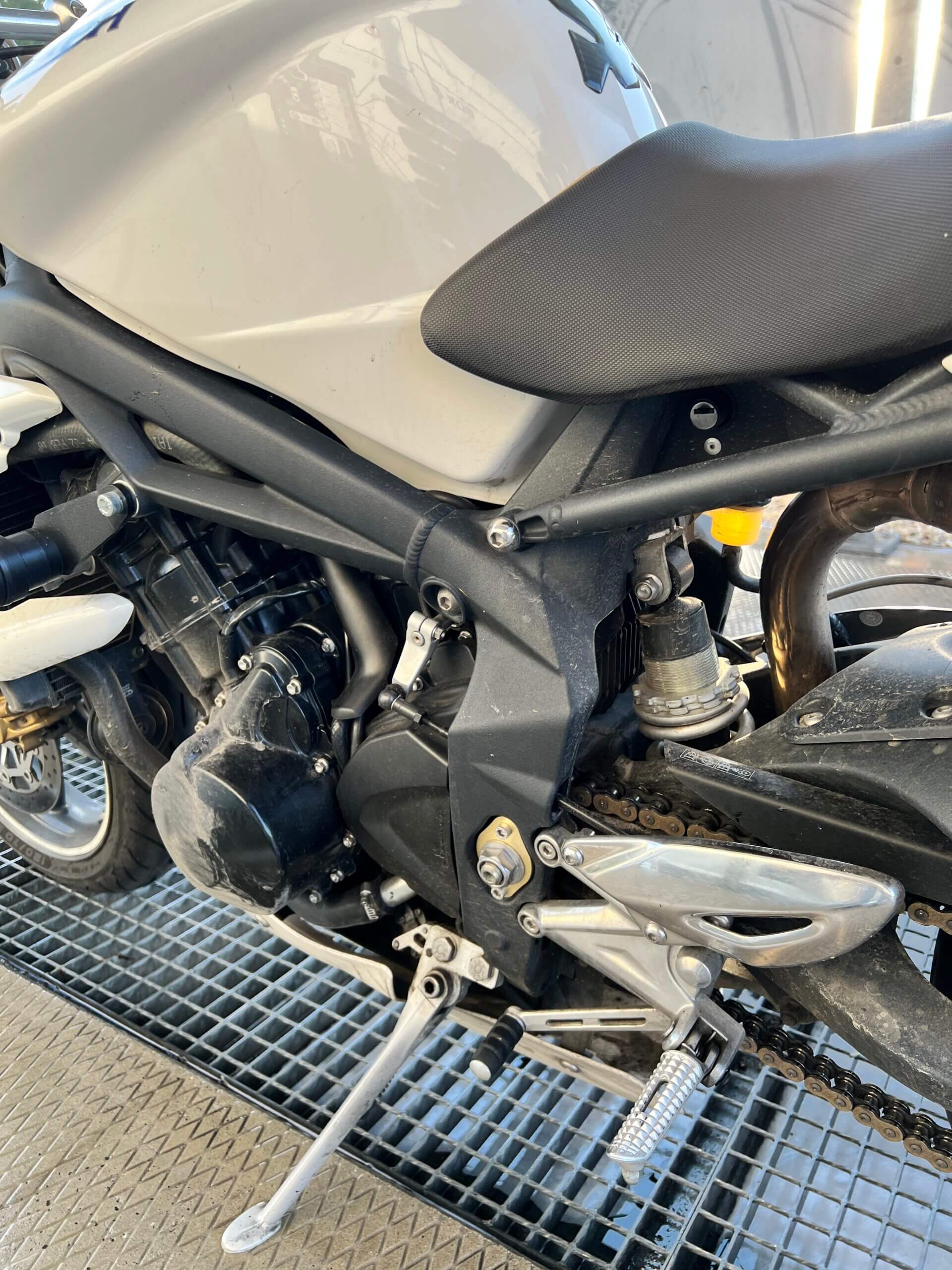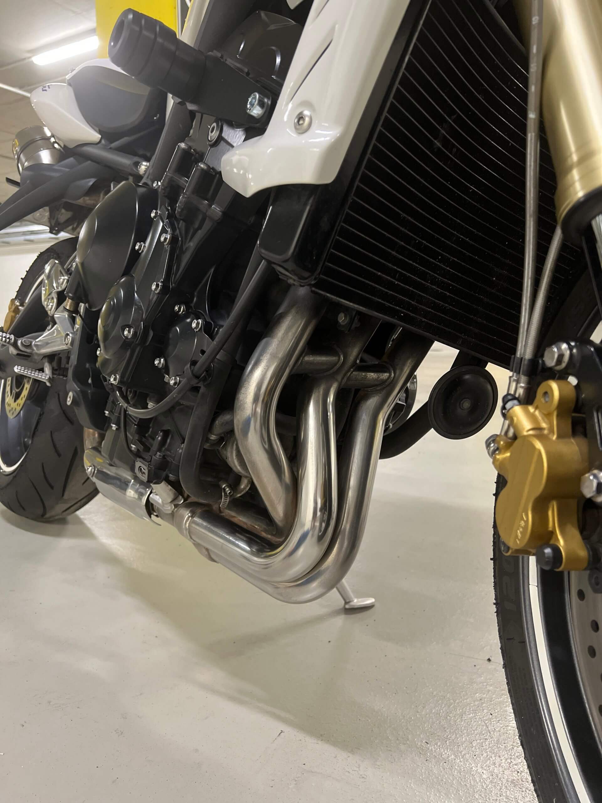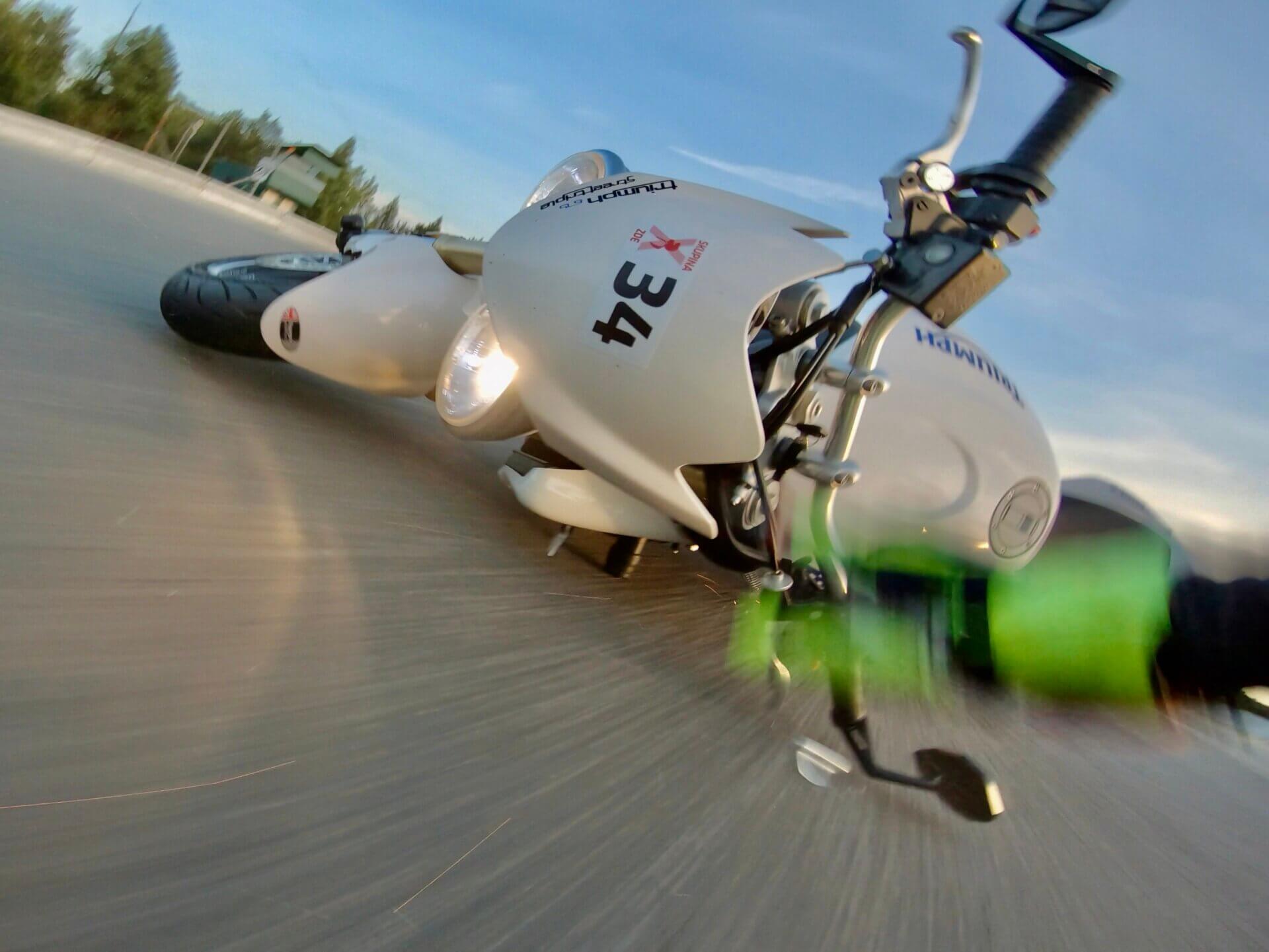 Nicméně protože jsem padal na okruhu a v servisu ti určitě nezkontrolují na úhel přesně celou přední část motorky, tlumiče, krk řízení a tak dále, vše jsem nahlásil a poslal motorku do Triumph Brno, kde tlumiče a celý předek motorky zkontrolovali a nenašli žádné poškození. Za celou událost jsem vlastně docela rád, protože mám papír, že motorce nic není – ne kvůli toho incidentu v garáži, ale po tom pádu z okruhu. Aneb když máš možnost motorku nechat zkontrolovat, tak proč bych to zadarmo neudělal?